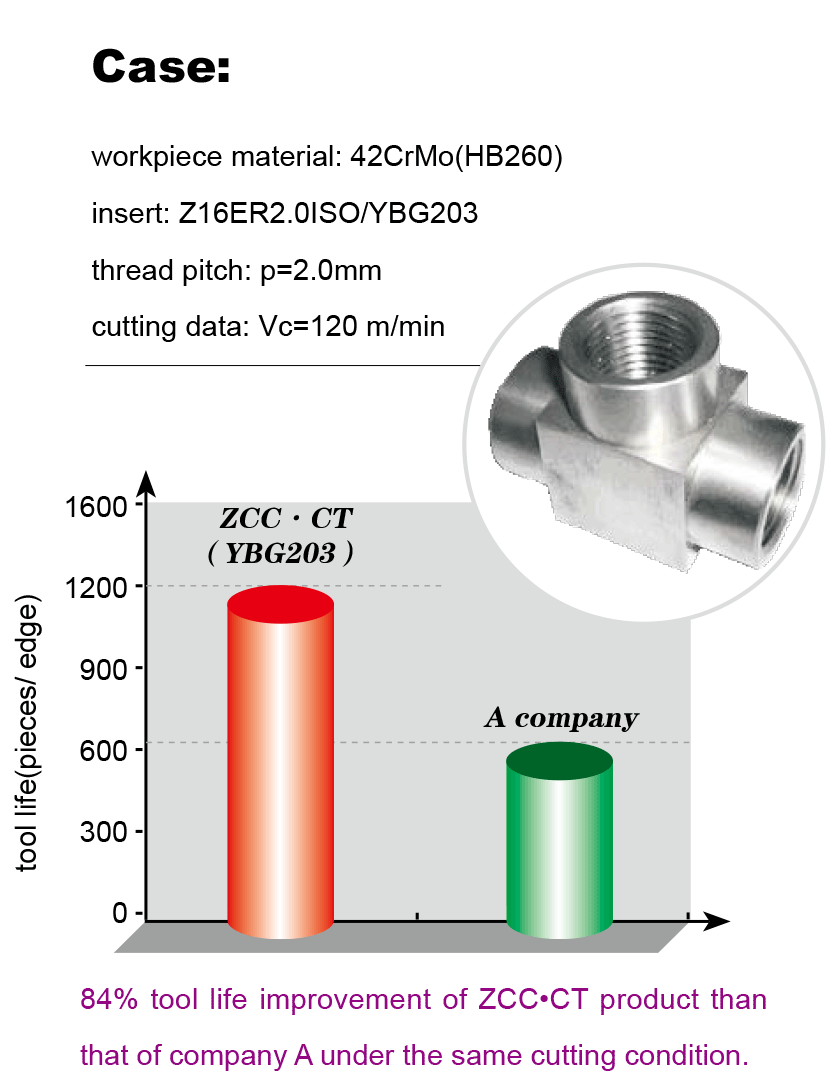 The chemical stability between Ti(CN) base cermet inserts and workpieces is relatively high, which reduces the friction and temperature of the cutting edge during cutting, preventing mutual diffusion of atoms of the workpiece material and the inserts, and improving resistance to bonding abrasion. Therefore, Ti(CN) base cermet shows good capability of Red Hardness and resistance to crater wear. It is an optimal material for high-speed finishing and semi-finishing of steel. High temperature strength of cermet is higher than that of WC-Co, and toughness better than that of Al2O3 and Si3N4 ceramic. This fulfils the application blank of WCbase cemented carbide and Al2O3 and Si3N4 ceramic from finishing to semi-finishing at high speed.